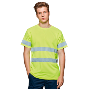 DESCRIPCIÓN: Camiseta técnica de manga corta de alta visibilidad. Cuello redondo en el mismo tejido, con cubrecosturas reforzado en la parte interior del cuello. Dos cintas reflectantes horizontales en torso y una en mangas.